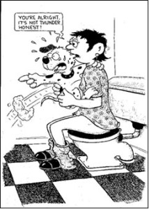 For fireworks either a variety of audio and video recordings of the noise or a cap gun can be used, whichever is capable of reproducing the fear response. Commercial CD’s are available that have been designed to reproduce these stimuli for desensitization training. It is important to start off with a noise at a volume that does not elicit any distress. The initial sound sometimes may be barely audible. For this reason it is probably better to have a CD or video of a firework display rather than using a cap gun. For gunshot fears and phobias however, a cap gun or starter’s pistol may ultimately be best since it also provides the visual cue of a gun. If a cap gun has to be used, this can be recorded at first and then played at minimal volume. Alternatively, the gun can be muffled using cardboard boxes and towels. Using a stereo surround-sound recording system is more likely to produce a sound that is most similar to the actual stimulus (fireworks). This same technique can also be used for thunderstorm phobias, using a video or audio recording of an actual storm. It is much harder to reproduce the actual event for retraining since the noise is not the only element of a thunderstorm and changes in barometric pressure, rain on the windows, darkening skies and flashes and bolts of lightening cannot be reproduced for retraining purposes and therefore not all dogs will respond to recordings and subsequent desensitization sessions.